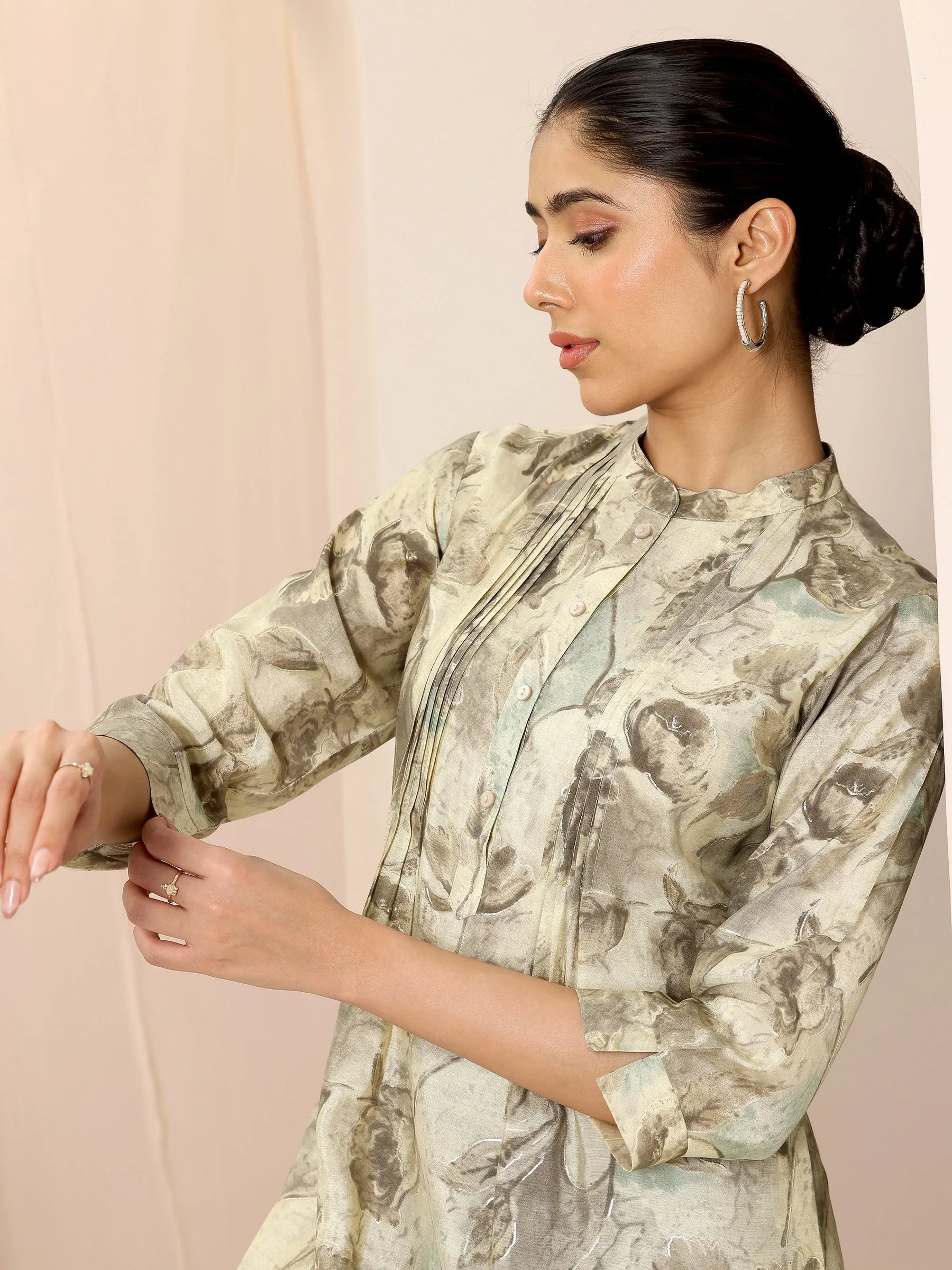 Beige Printed Silk Blend Straight Short Kurti