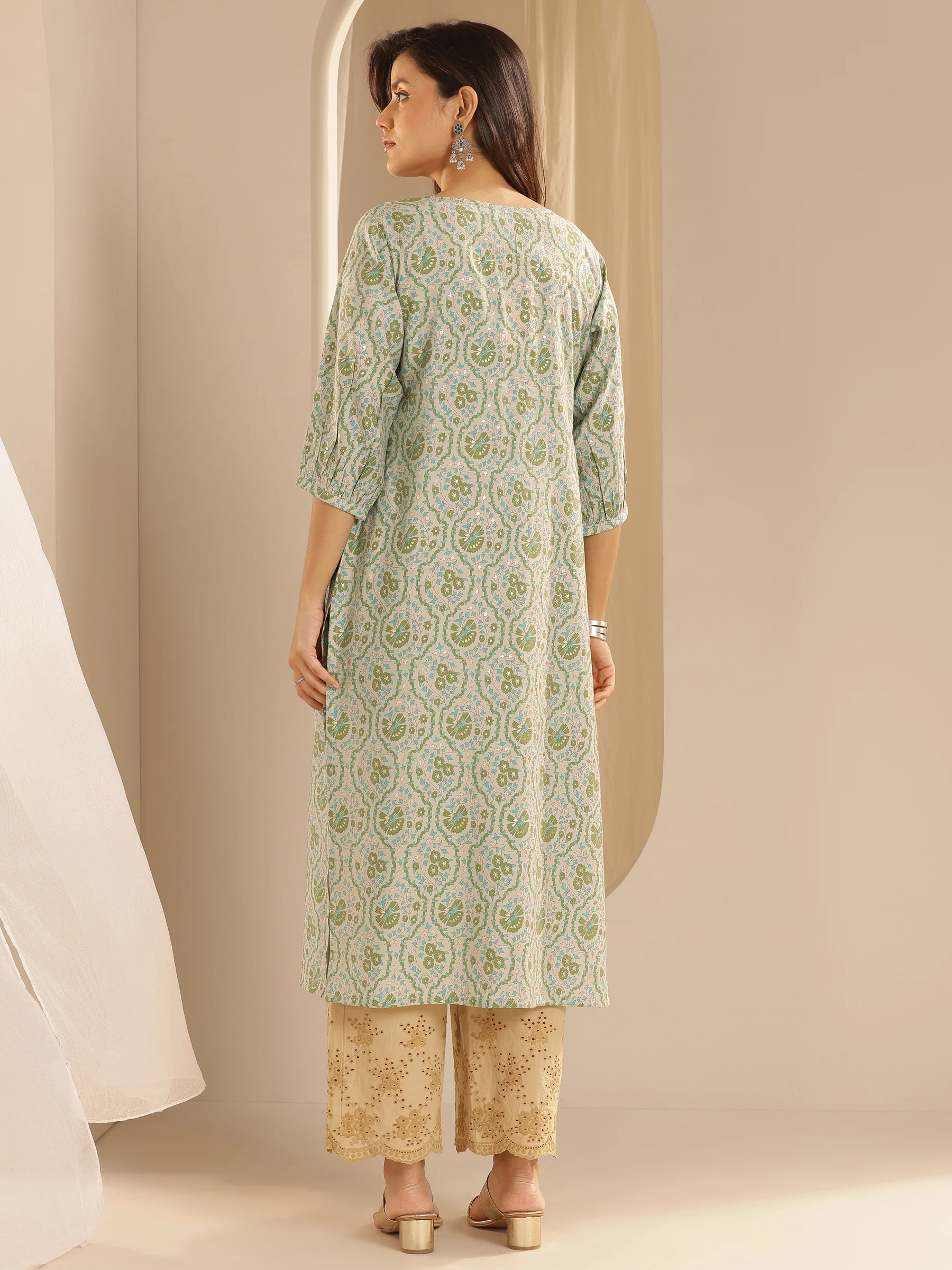Green Printed Silk Straight Kurta
