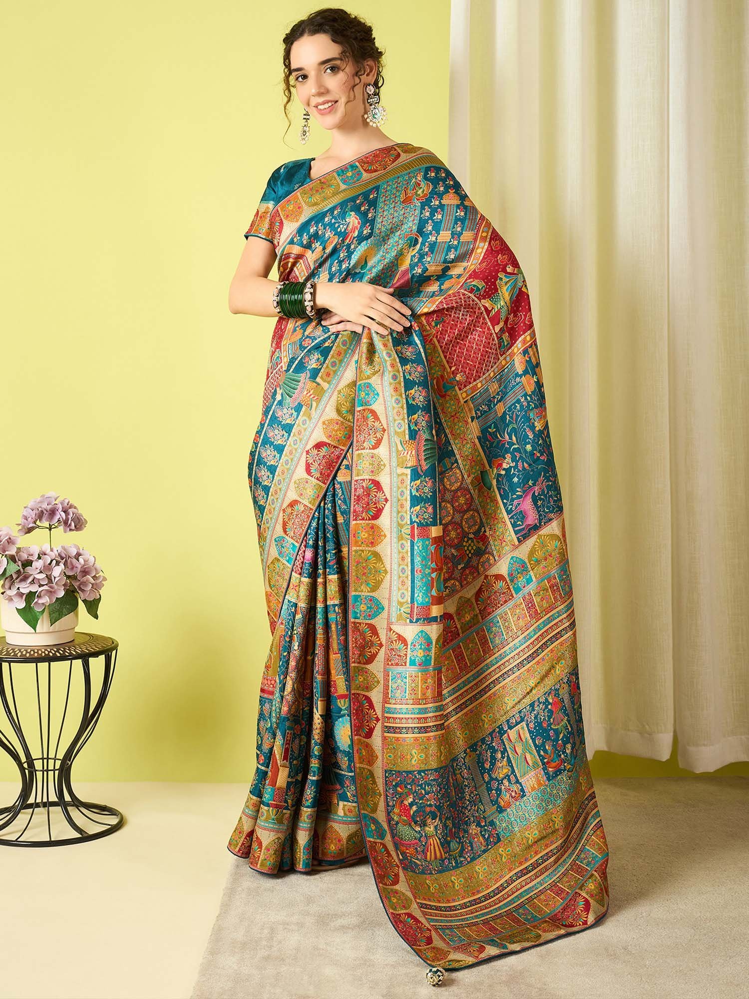 Teal Woven Viscose Saree with Unstitched Blouse